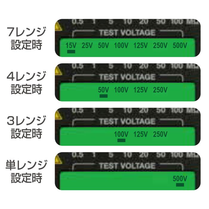 Despite its pocket-sized design, this tester provides a selection of 7 test voltages (15/25/50/100/125/250/500 V) that can be easily chosen and fixed, preventing any inadvertent selection of the higher 500 V option.